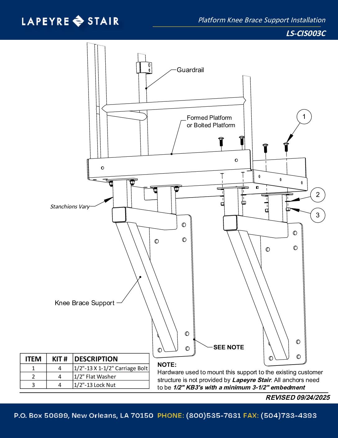 Platform Knee Brace Support Installation Packet